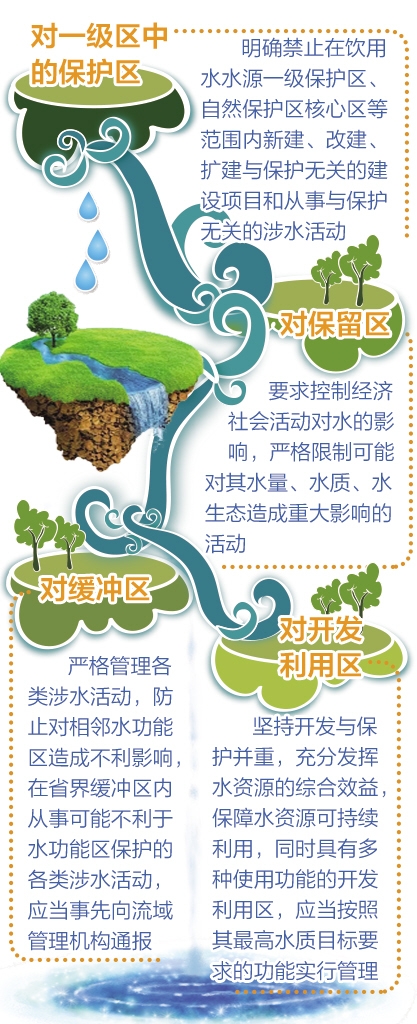 該辦法還對水功能區(qū)限制納污管理作了嚴(yán)格規(guī)定。石秋池說,為落實國務(wù)院對全國重要江河湖泊水功能區(qū)的批復(fù)要求和全面推行河長制的有關(guān)要求,辦法將水功能區(qū)限制納污管理作為核心內(nèi)容,從以下5個方面作了規(guī)定: